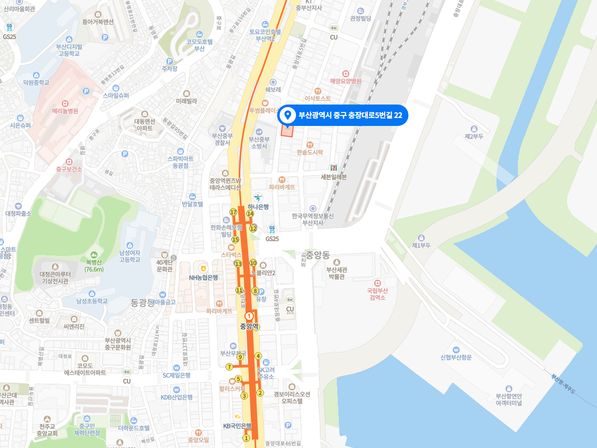 주소 : (48938) 부산광역시 중구 충장대로5번길 22 (중앙동4가) SM상선빌딩 7층